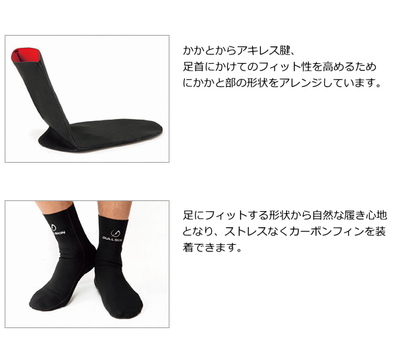 かかと部分が立体構造になっており足にフィットし、足首まで保温できる機能性ソックス。フィンずれや、サイズの調整などに便利なアイテム。